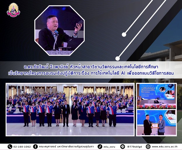 NONTHABURI – On October 24, 2025, Dr. Chaiwat Jewpanich, Head of the Innovation and Educational Technology Program, Faculty of Education, Suan Sunandha Rajabhat University, was invited as a distinguished guest speaker for a workshop titled "Using AI Technology to Design Instructional Videos."