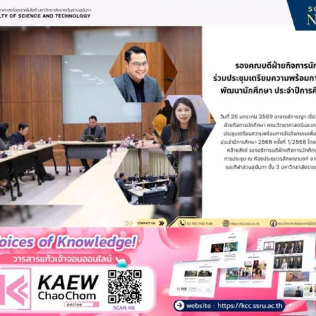 News & Event Associate Dean for Student Affairs Attends Preparatory Meeting for 2025 Academic Year Student Development Activities Faculty of Humanities and Social Sciences Commends Outstanding Student for Volunteerism and Active Participation Associate Dean for Student Affairs Attends Preparatory Meeting for 2025 Academic Year Student Development Activities English Program, Faculty of Education, Conducts Classroom Research Proposal Presentations for Senior Students Executives and Staff of the College of Politics and Government Attend the 12th Suan Sunandha Rajabhat University Council Meeting of 2025 College of Logistics and Supply Chain Executives Meet with CPS Shipping & Logistics Co., Ltd. to Strengthen Professional Internship Collaborations College of Architecture Conducts the 1st Thesis Review (Group 2) for 5th-Year Students with Distinguished National Artists and Experts College of Allied Health Sciences Collaborates with Samut Songkhram Agricultural Council for Sustainable Conservation of GI-Certified "Kom" Lychee Suan Sunandha Communication Arts Invades Wat Nong Khaem School: Transforming PR Students into Future Influencers 1 2 3 4