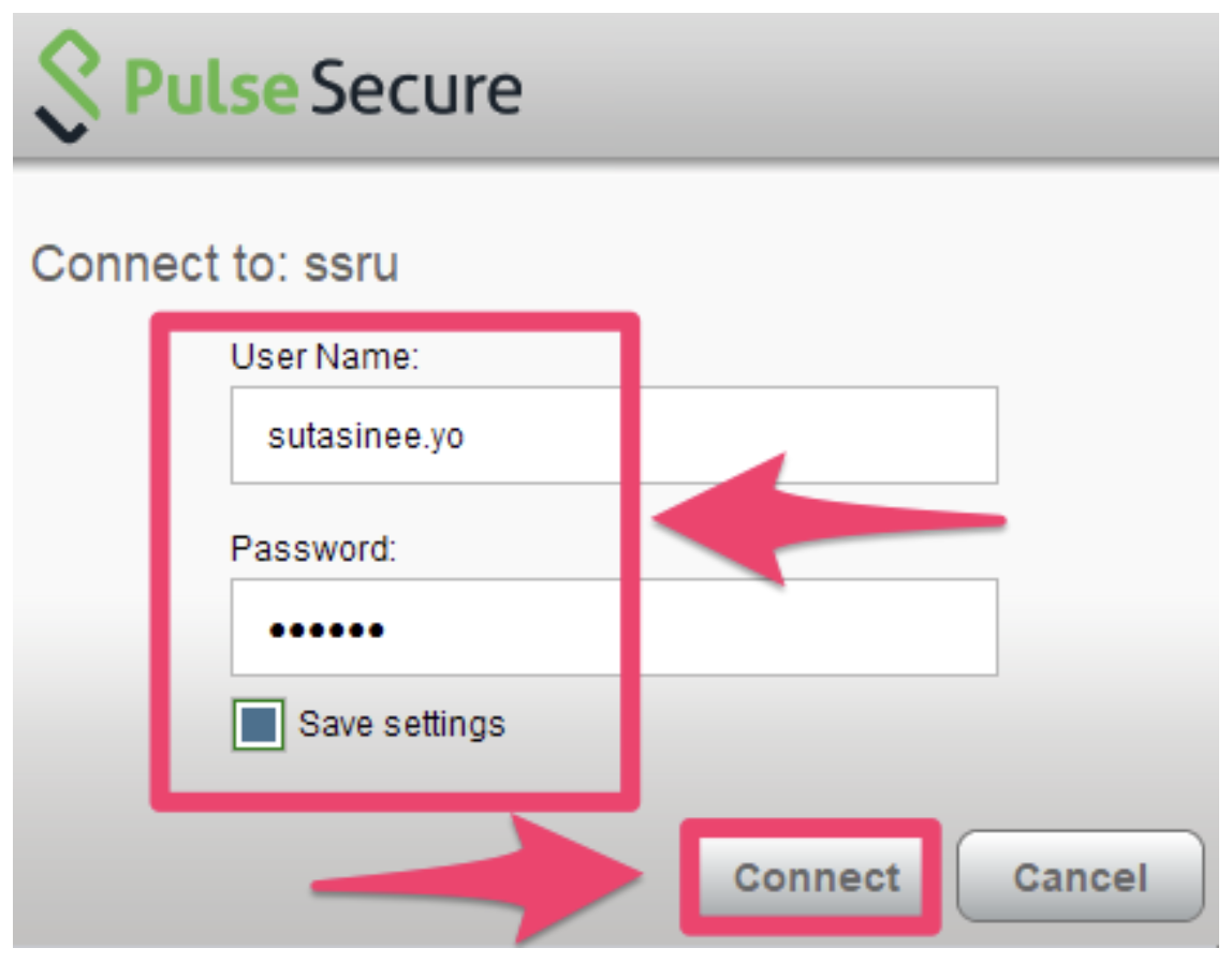 Step 7:Please enter the User Name and Password you use to access the internet at SSRU. If you wish to save the User Name and Password, check the 'Save Settings' option. Once done, click the 'Connect' button.