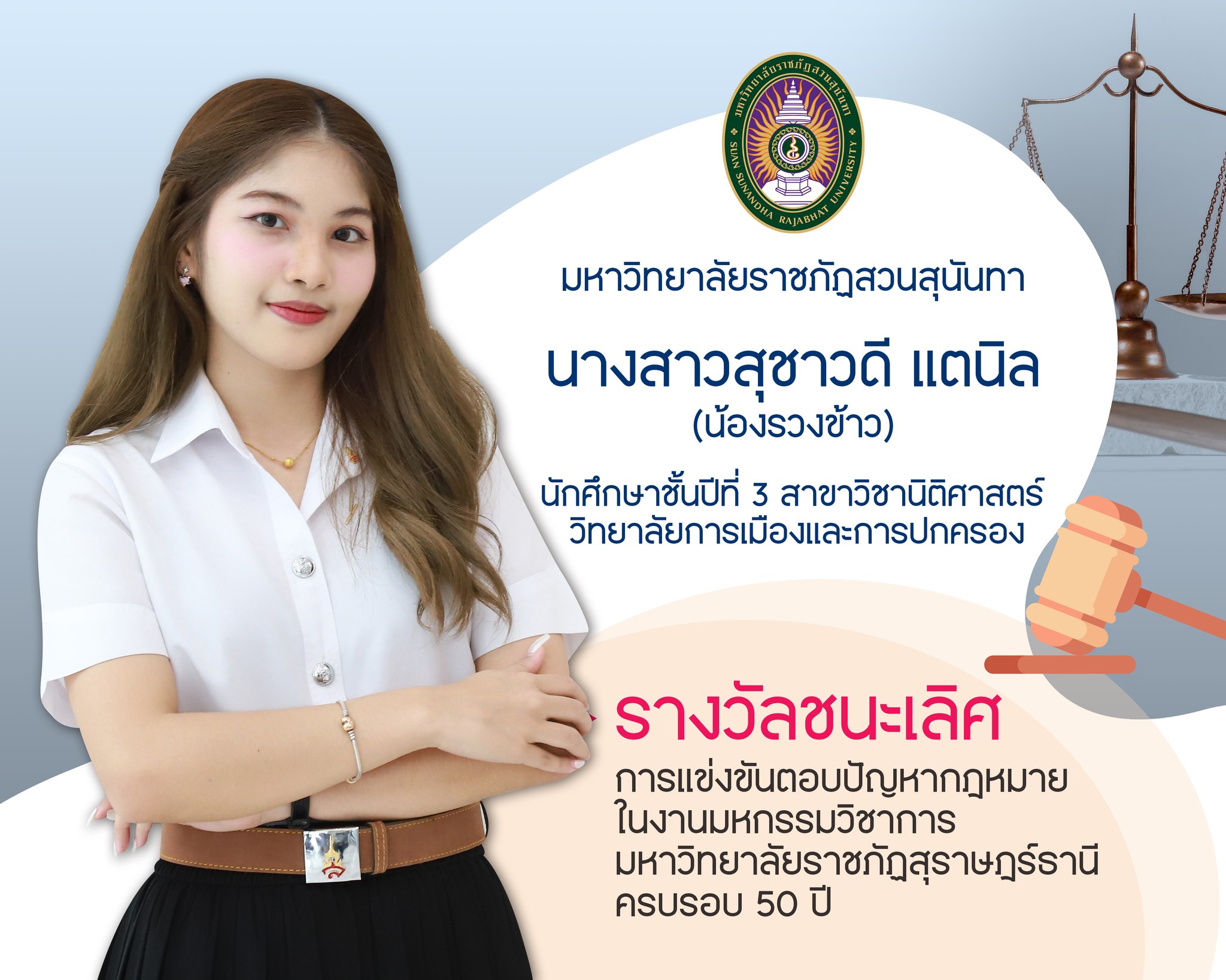 ขอแสดงความยินดีกับ “นางสาวสุชาวดี แตนิล” (น้องรวงข้าว) นักศึกษาชั้นปีที่ 3 สาขาวิชานิติศาสตร์ วิทยาลัยการเมืองและการปกครอง ขอแสดงความยินดีกับ “นางสาวสุชาวดี แตนิล” (น้องรวงข้าว) นักศึกษาชั้นปีที่ 3 สาขาวิชานิติศาสตร์ วิทยาลัยการเมืองและการปกครอง ที่ได้คว้ารางวัลชนะเลิศ การแข่งขันตอบปัญหากฎหมาย ในงานมหกรรมวิชาการ มหาวิทยาลัยราชภัฏสุราษฎร์ธานี ครบรอบ 50 ปี
