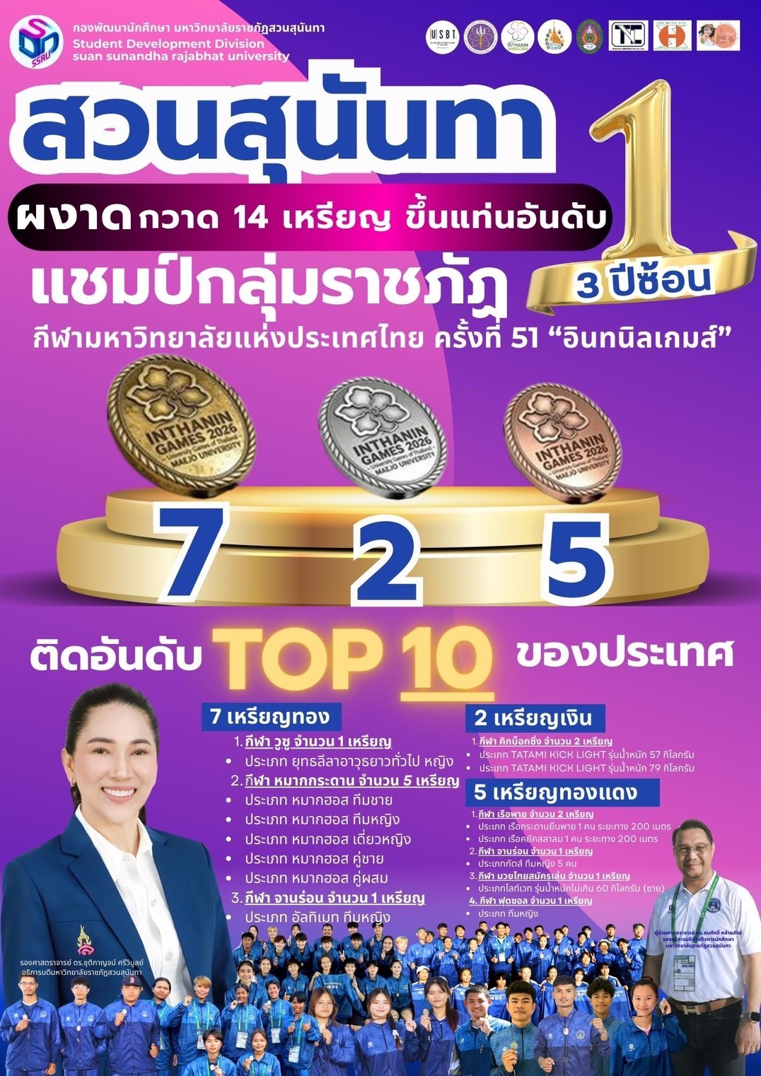 ในการแข่งขันกีฬามหาวิทยาลัยแห่งประเทศไทย ครั้งที่ 51 “อินทนิลเกมส์” ณ มหาวิทยาลัยแม่โจ้ จ.เชียงใหม่ ระหว่างวันที่ 9 – 19 มกราคม 2569 ทัพนักกีฬามหาวิทยาลัยราชภัฏสวนสุนันทา สร้างผลงานปิดฉากศึก “อินทนิลเกมส์ 2026” ในครั้งนี้ ได้อย่างยอดเยี่ยม ในการคว้าเหรียญรางวัลมากที่สุด ในบรรดามหาวิทยาลัยราชภัฏ 38 แห่งทั่วประเทศ 3 ปีต่อเนื่อง 7 เหรียญทอง 2 เหรียญเงิน และ 5 เหรียญทองแดง พร้อมขยับอันดับขึ้นจากปีที่แล้วติดอันดับ TOP 10 ระดับประเทศ ได้อย่างสมบูรณ์แบบ โดยทำสถิติ ครองแชมป์เจ้าเหรียญทอง อันดับ 1 กลุ่มมหาวิทยาลัยราชภัฏ 38 แห่งทั่วประเทศ